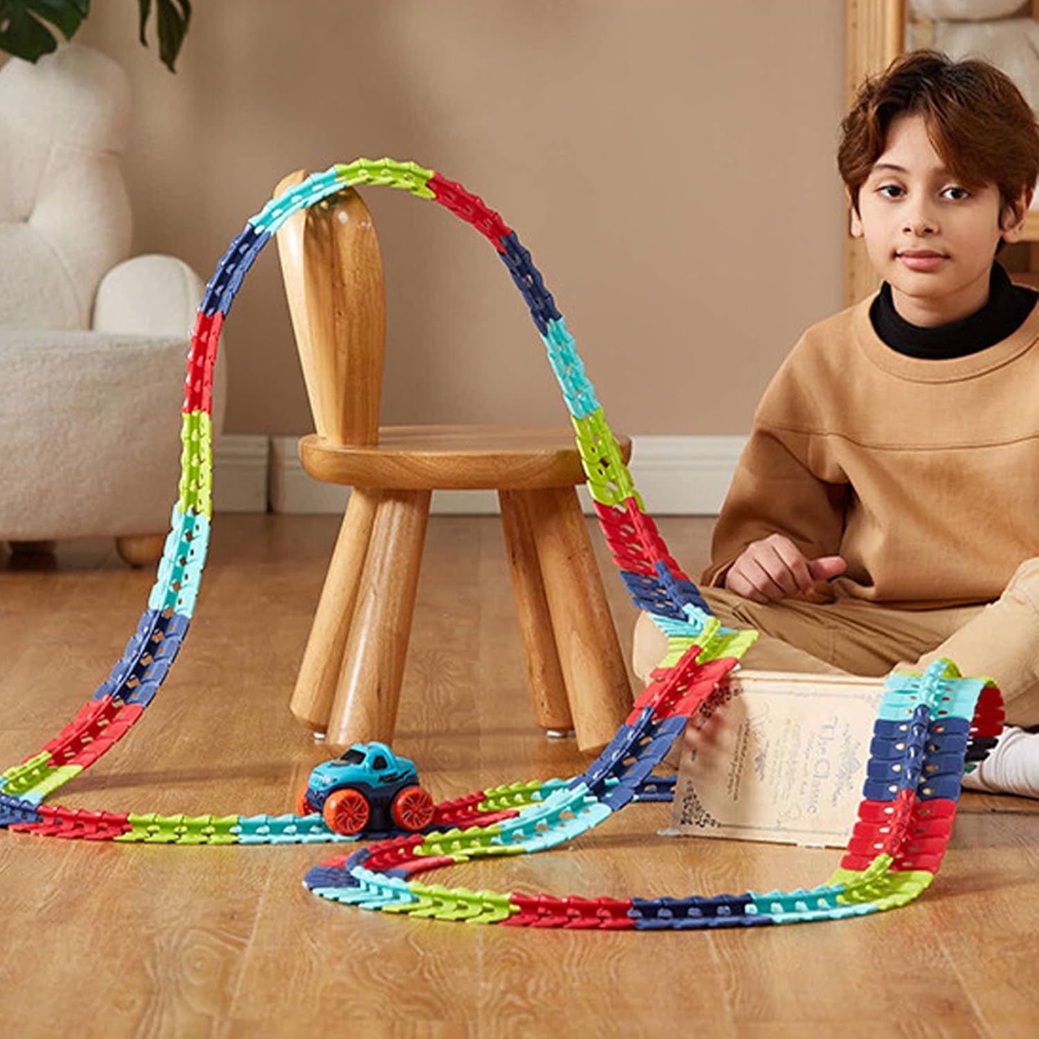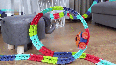 Klik de buigbare baandelen eenvoudig aan elkaar en vorm je eigen racebaan. Over de vloer, onder de tafel door of over stoelen heen. Alles kan!